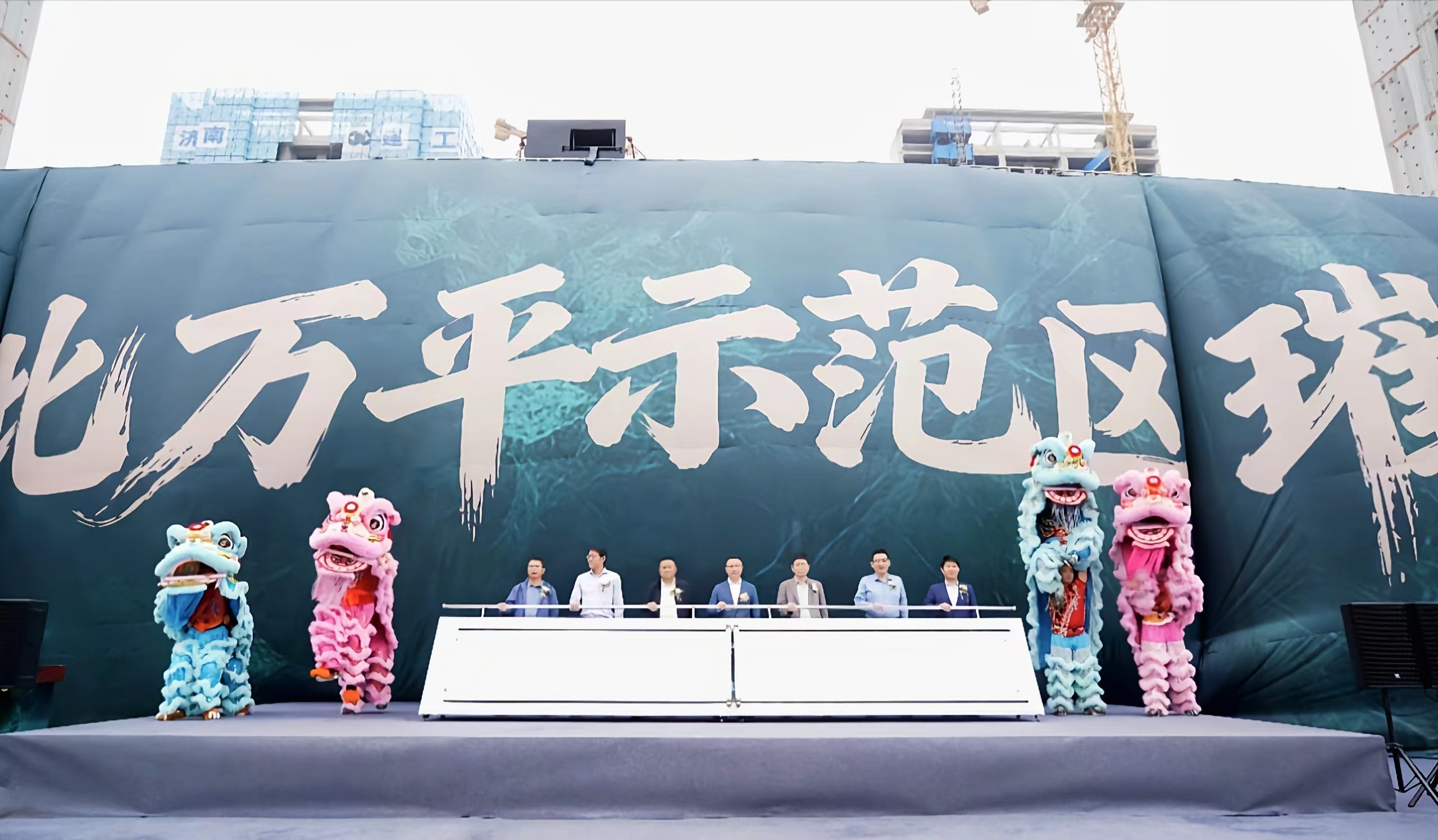 十點十分,祥瑞舞獅躍動登場,昂揚騰挪間,為項目注入吉祥寓意與勃勃生機(jī),將現(xiàn)場氛圍推向高潮。接著,在全場嘉賓的矚目與倒數(shù)聲中,張總攜手多位領(lǐng)導(dǎo)共同推動啟動桿,舞臺吸幕瞬間升起,金海瑞園恢弘的大門豁然眼前,萬平園林示范區(qū)的勝景也在此刻全景呈現(xiàn),引來陣陣贊嘆。同時,舞獅吐青,卷軸鋪展,“責(zé)任國企,品質(zhì)筑家;瑞境天成,盛啟非凡”十六字宣言熠熠生輝,標(biāo)志著金海瑞園萬平園林示范區(qū)正式華彩綻放。最后,各位領(lǐng)導(dǎo)在舞臺上合影留念,定格這一意義非凡的瞬間。